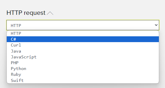 First head over to the desired APIs api details page, press the green try it button as if you should send a new request. Scroll down untill you see "HTTP Request". As standard, it is set to HTTP, but you can choose other options like C# from the drop down menu like shown below.