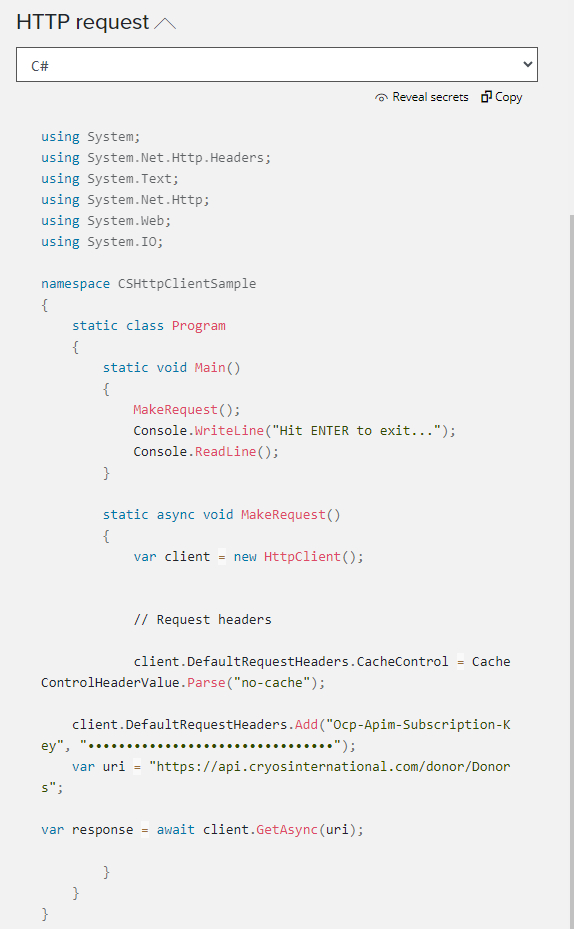 Copy the generated code, and remember to replace the dots under Client.DefaultRequestHeaders with the actual subscription key.