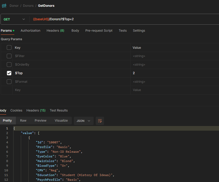 Now you are ready to request data from the API - head over to the Params tab right left under the GET operation and deselect all of the Query params and just enter 2 for $top - just to check if you can get any response back.